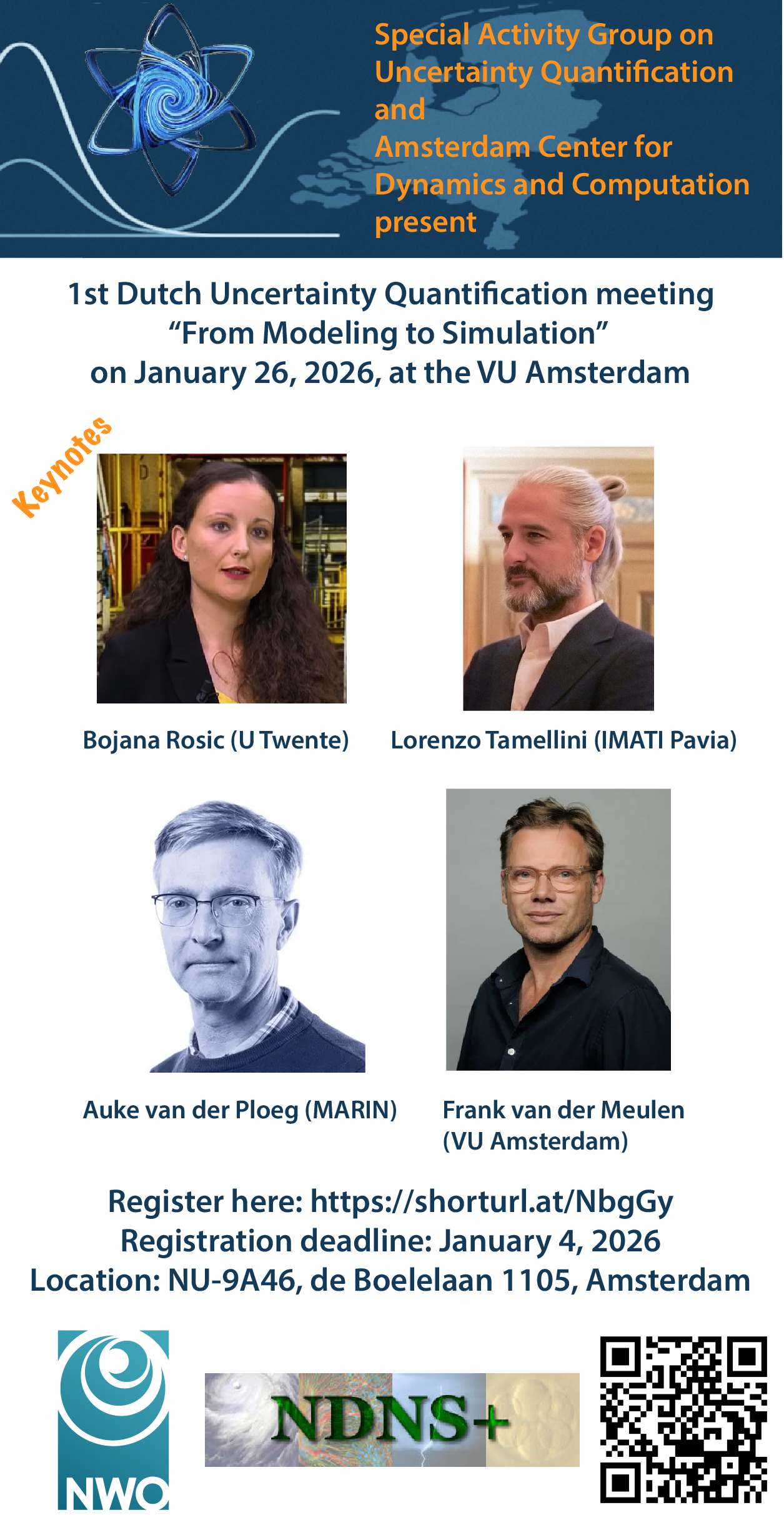 The event will be hosted by the VU's Amsterdam Centre for Dynamics and Computation, and marks the establishment of the NDNS+ Special Activity Group Uncertainty Quantification: from Modeling to Simulation (SAG UQ).